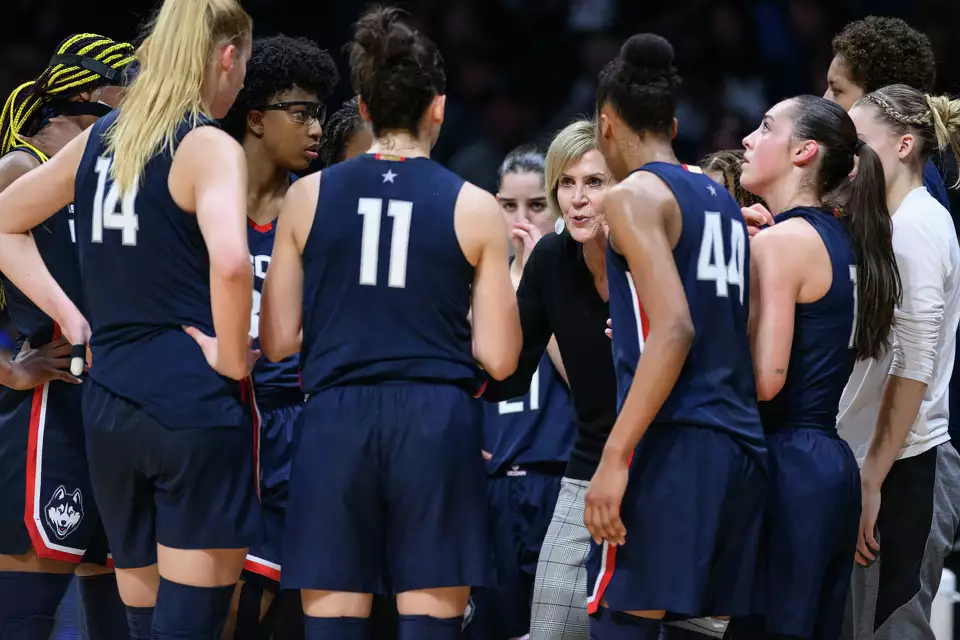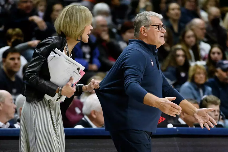 در عکس مطلب؛ دستیار سرمربی، کریس دیلی، سمت چپ، با سرمربی کانکتیکات، جنو اوریما صحبت میکند. ( نیمه دوم یک بازی بسکتبال کالج NCAA – دسامبر 2022)